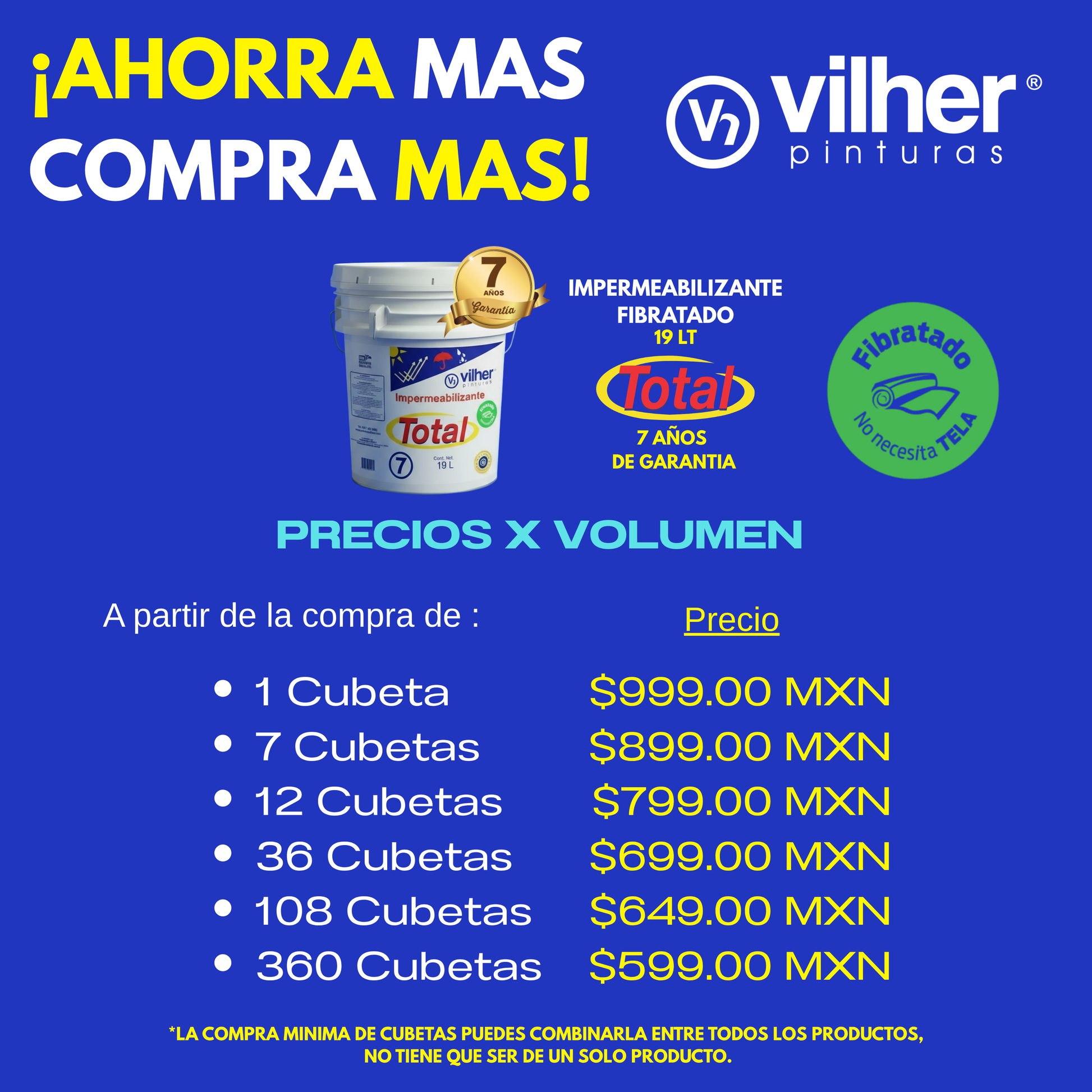 Impermeabilizante Fibratado TOTAL 19 Litros 7 Años: de un solo componente, muy buena elasticidad y secado, repelente al agua, para superficies horizontales exteriores de mampostería, asbesto, madera y metálicas previamente tratadas. Con gran poder reflejante* y aislante térmico. Este impermeabilizante se aplica a temperatura ambiente, es decir, es de "aplicación en frio". Tiene una durabilidad media estimada de 7 años.
